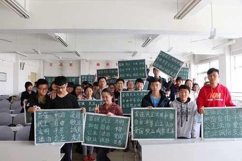 本届师范生粉笔字大赛共举办四场初赛,一场决赛。本次比赛为初赛第一场,以宿舍为单位各推荐一名选手参加,比赛内容为在三分钟内书写完社会主义核心价值观。