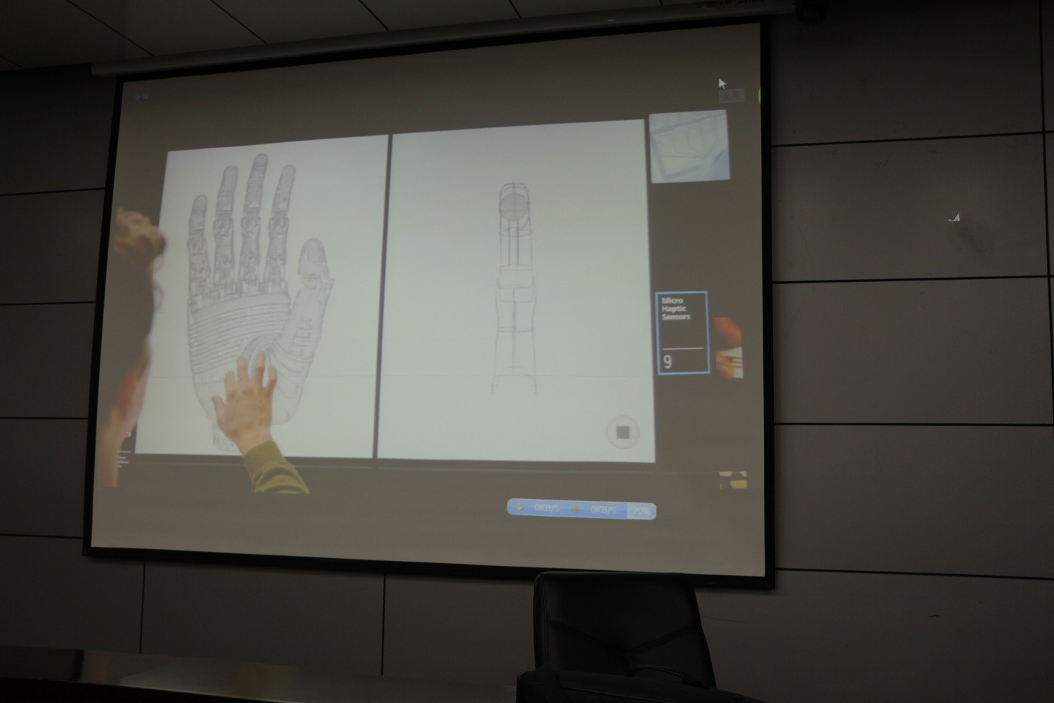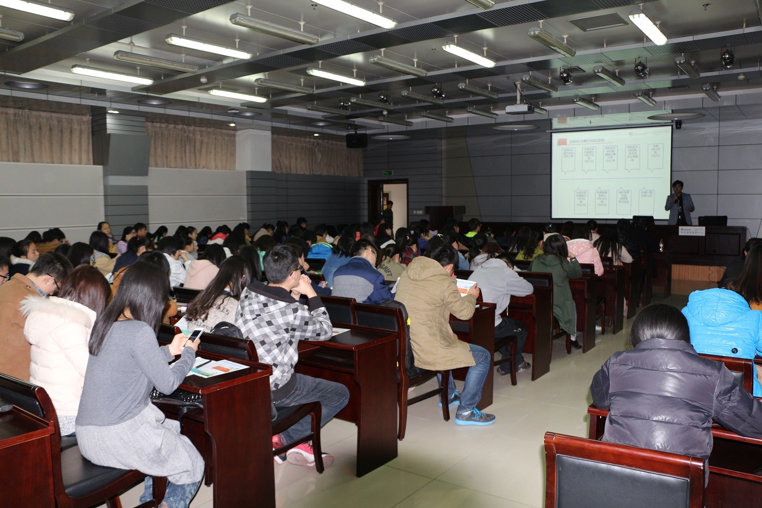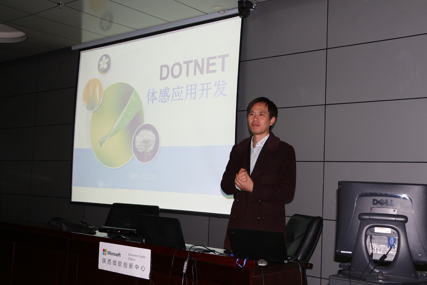 在讲座正式开始前,陕西微软创新中心的老师为大家展示了微软体感技术的相关视频,让大家对于微软最新体感技术有了初步的了解。随后,微软创新中心的市场部经理符泽轩为大家介绍了创新杯大赛复赛阶段的具体流程,参赛者需要准备的复赛资料,以及创新杯后阶段的计划与安排。同时,他向大家展示了去年微软创新杯的优秀作品视频,鼓励大家发散思维,勇于尝试,大胆创新。接下来,微软创新中心的特聘讲师马卫卫为大家现场演示了有关kinect体感产品的人体骨骼取样和动作分析,并对相关的代码做出了解释。马老师还通过视频向大家展示了kinect的具体应用,让现场的同学们大开眼界。最后,马老师和符经理对大家的提问做出了详细解答,鼓励大家发挥想象力,结合实际共同思考更加丰富的体感应用。