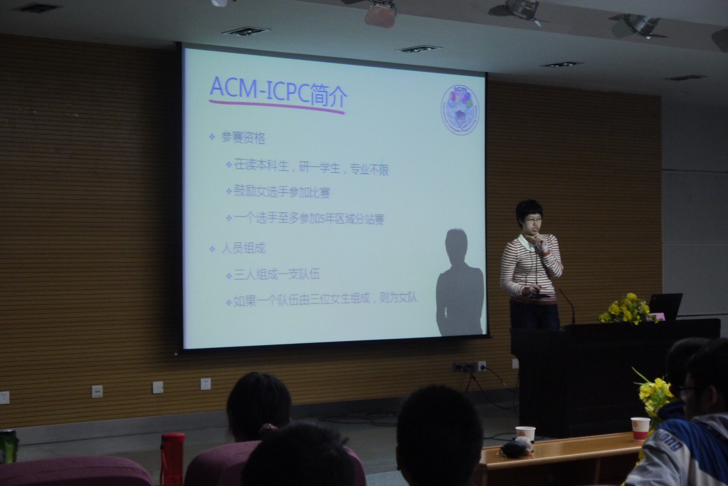 ACM竞赛团队成员张瑞文向在座2013级同学介绍了ACM-ICPC(即国际大学生程序设计大赛)的竞赛规则、赛制、耽美小说