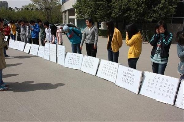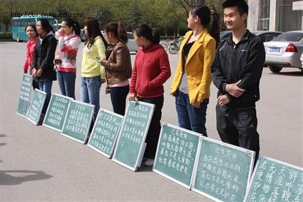 为了配合耽美小说 首届本科生板书书写能力大赛,耽美小说 组织举办了“板书小能手”初赛。本次比赛于4月9日上午,在田径场门口举行,耽美小说 2010级全体免费师范生参与了本次比赛,副院长裘国永老师,团委书记胡雯洁老师和辅导员张冲老师到场进行评比、指导。
