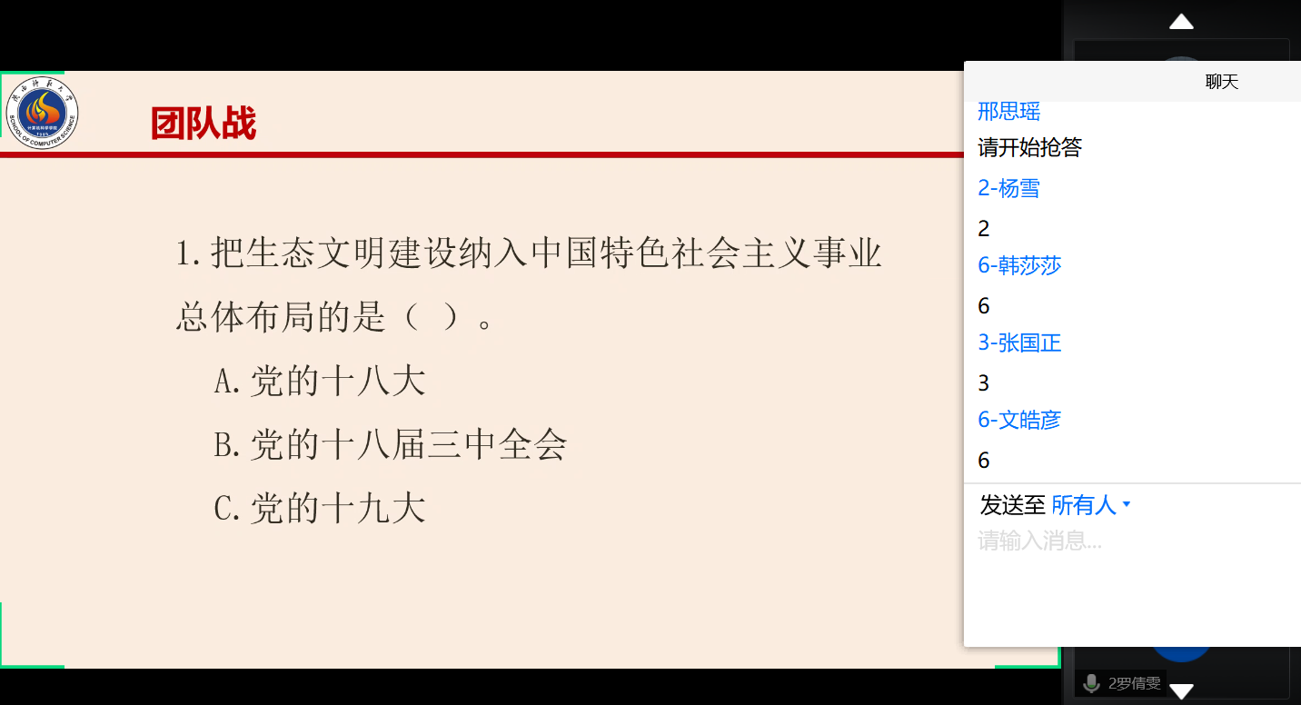 决赛分为两轮,在腾讯会议平台上开展。第一轮为团队赛,共有24道单选题。各参赛团队反应迅速,踊跃参与,在讨论区发送组号进行抢答。经过激烈的比拼,共有15名选手晋级第二轮个人战,选手们轮流回答单选、多选、填空和论述题,刘真、甘毓琪等同学在论述环节的发言旁征博引,充分体现了当代大学生的风采担当与过硬的思想政治素质。全体参赛选手还共同学习了复旦大学中国研究院院长张维为先生的演讲《中国的自信一代》,更加坚定了与时代一起成长、与国家一起崛起的信心。
