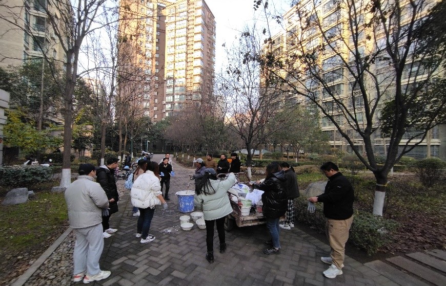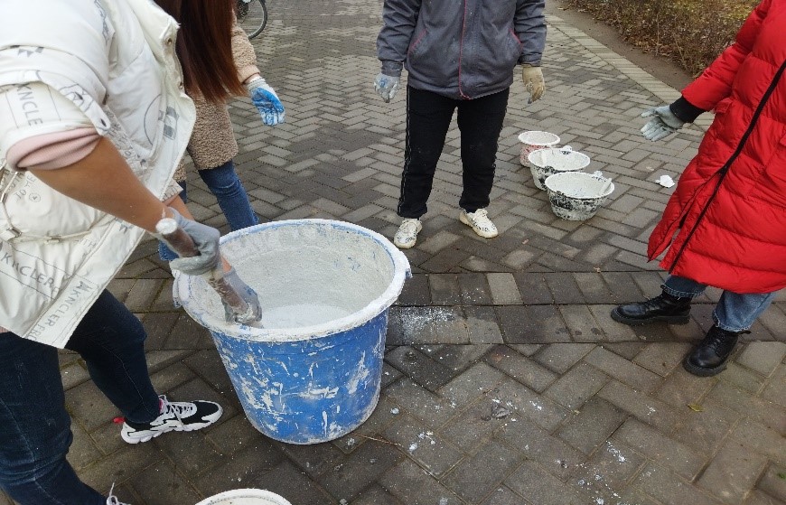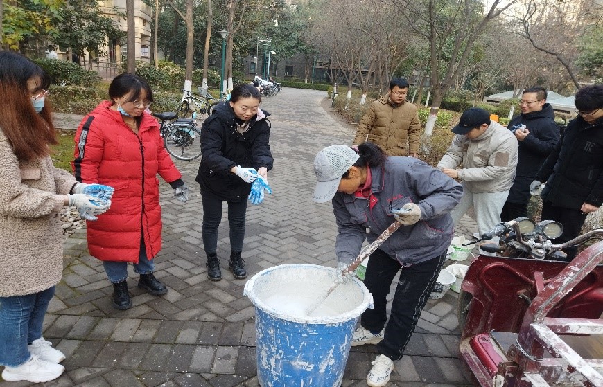 八点二十,同学们早早地聚集在家属院一期门口,后勤服务中心的工作人员为大家说明了活动范围和注意事项,同学们配合工作人员完成石灰水涂料的调制,并领取手套、刷白漆的小桶和刷子,随后分组开展活动。